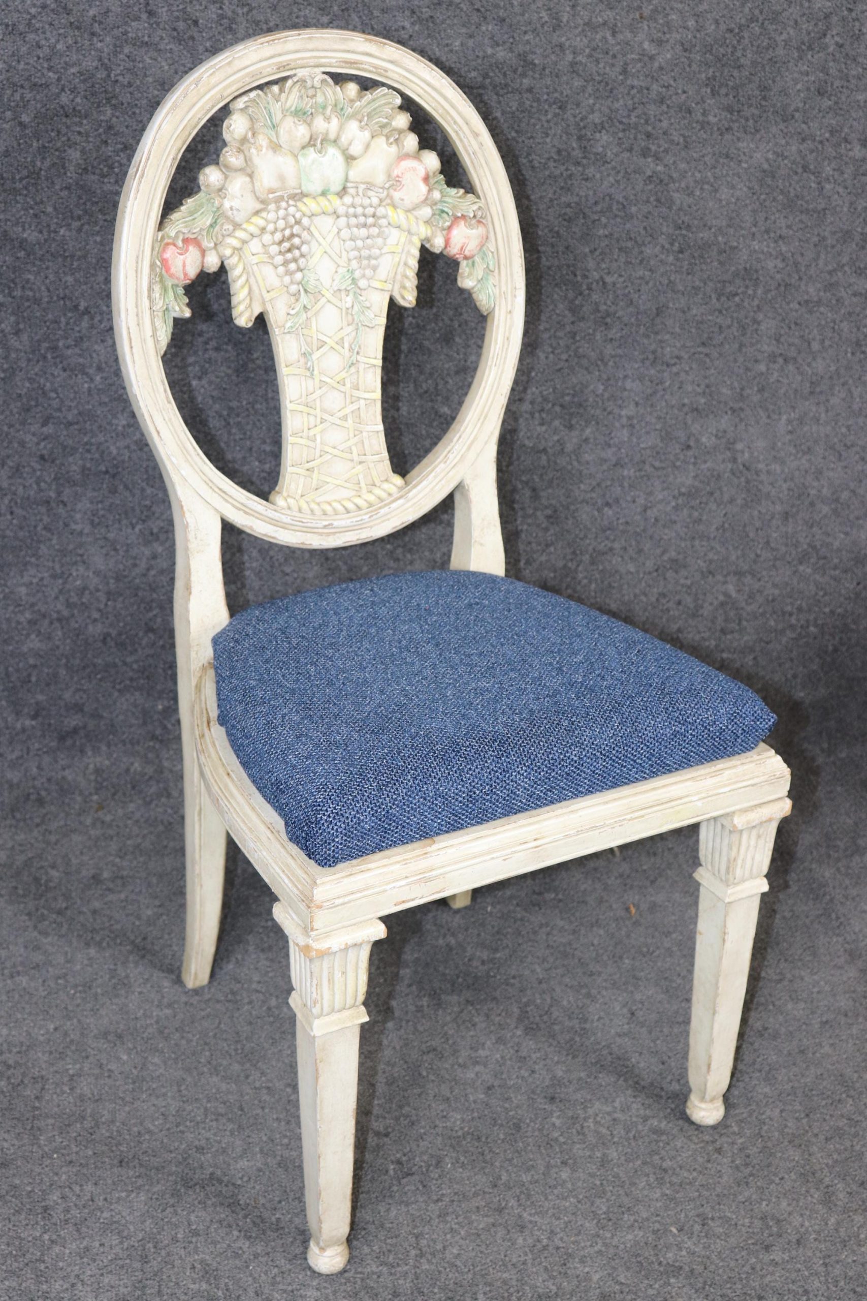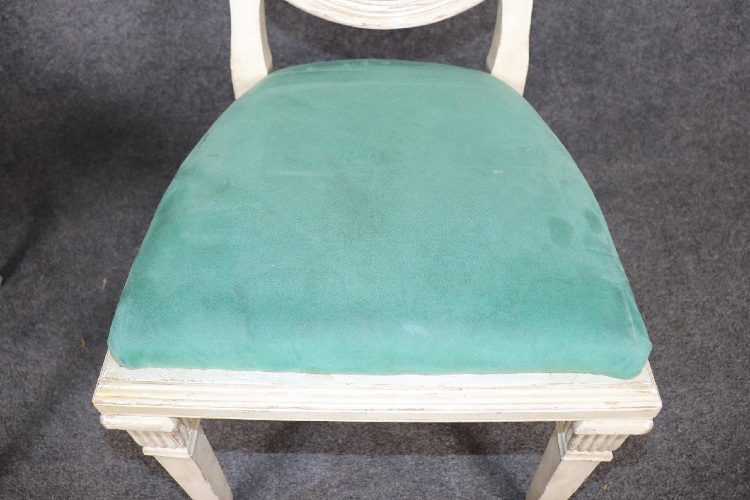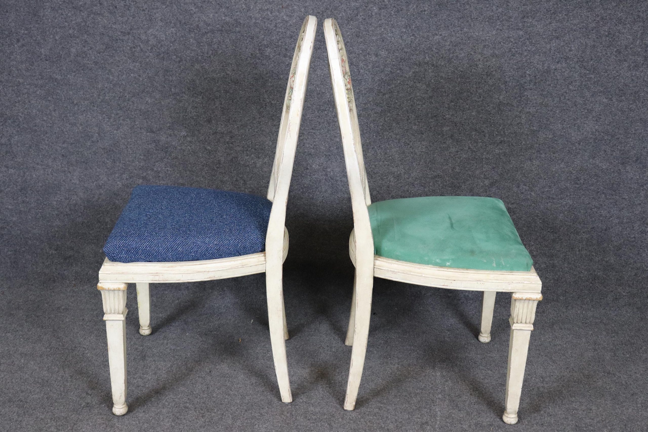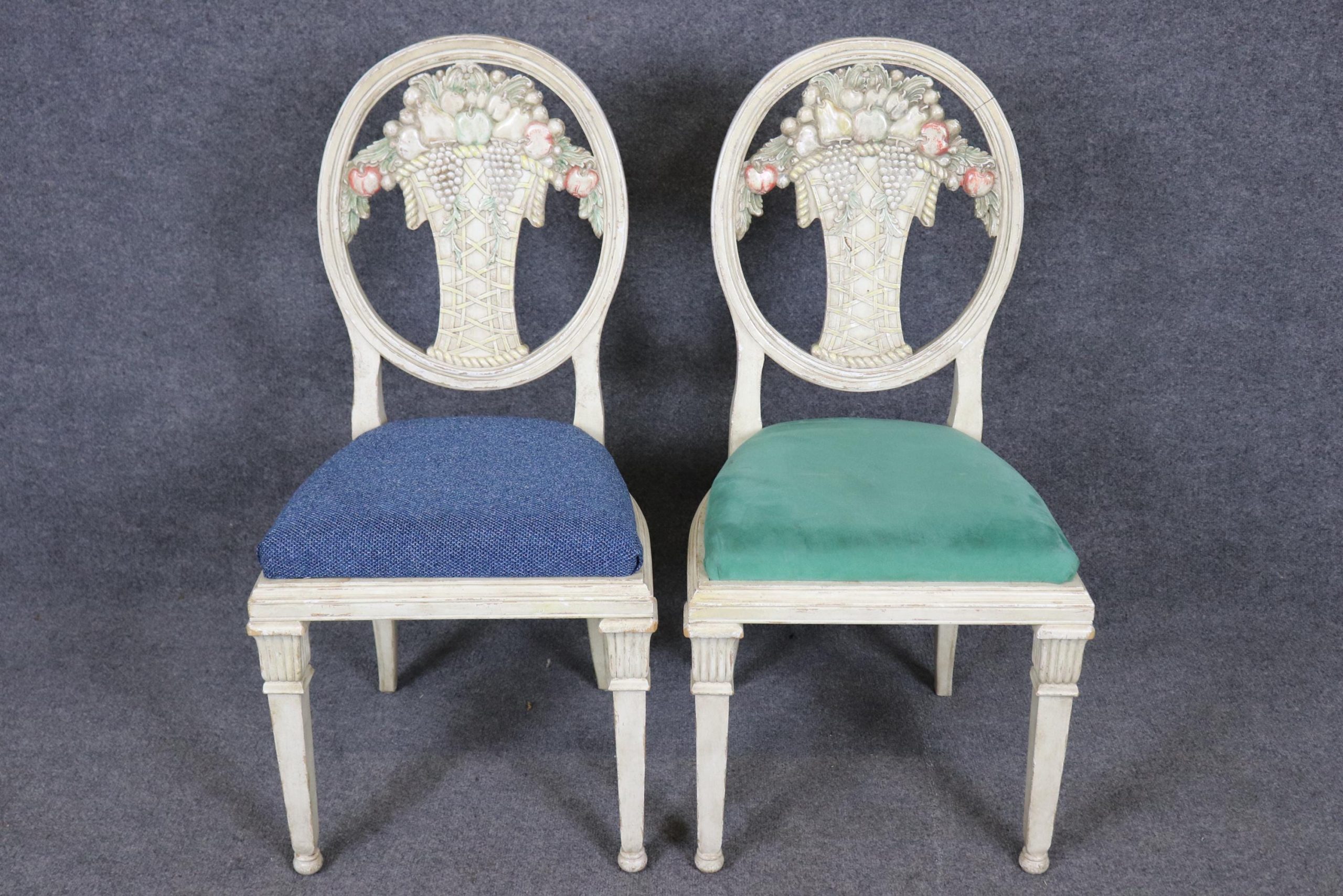 This vintage Mid Century set of 6 Directoire style paint decorated side chairs is made of the highest quality! If you look at the photos provided you will see the attention to detail in the carved backs. This pair is perfect for any living room, kitchen, parlor, entryway or dining area and can even be used for a small game table. One really nice aspect to this pair is their ability to be used on a daily basis as they are strong and sturdy and not only for show. This pair is bound to bring a sense of luxury and character into your home or place of choosing and is bound to be a topic of conversation at your next gathering or event! Antique furniture and vintage pieces have stood the test of time and this set of chairs is no exception! With its quality materials and great craftsmanship this set is bound to last you and your family for many years to come. The pair is in good vintage condition with the exception of some finish loss and light surface scratches. The upholstery appears to be in good condition, but may show some signs of wear. Otherwise, good condition.