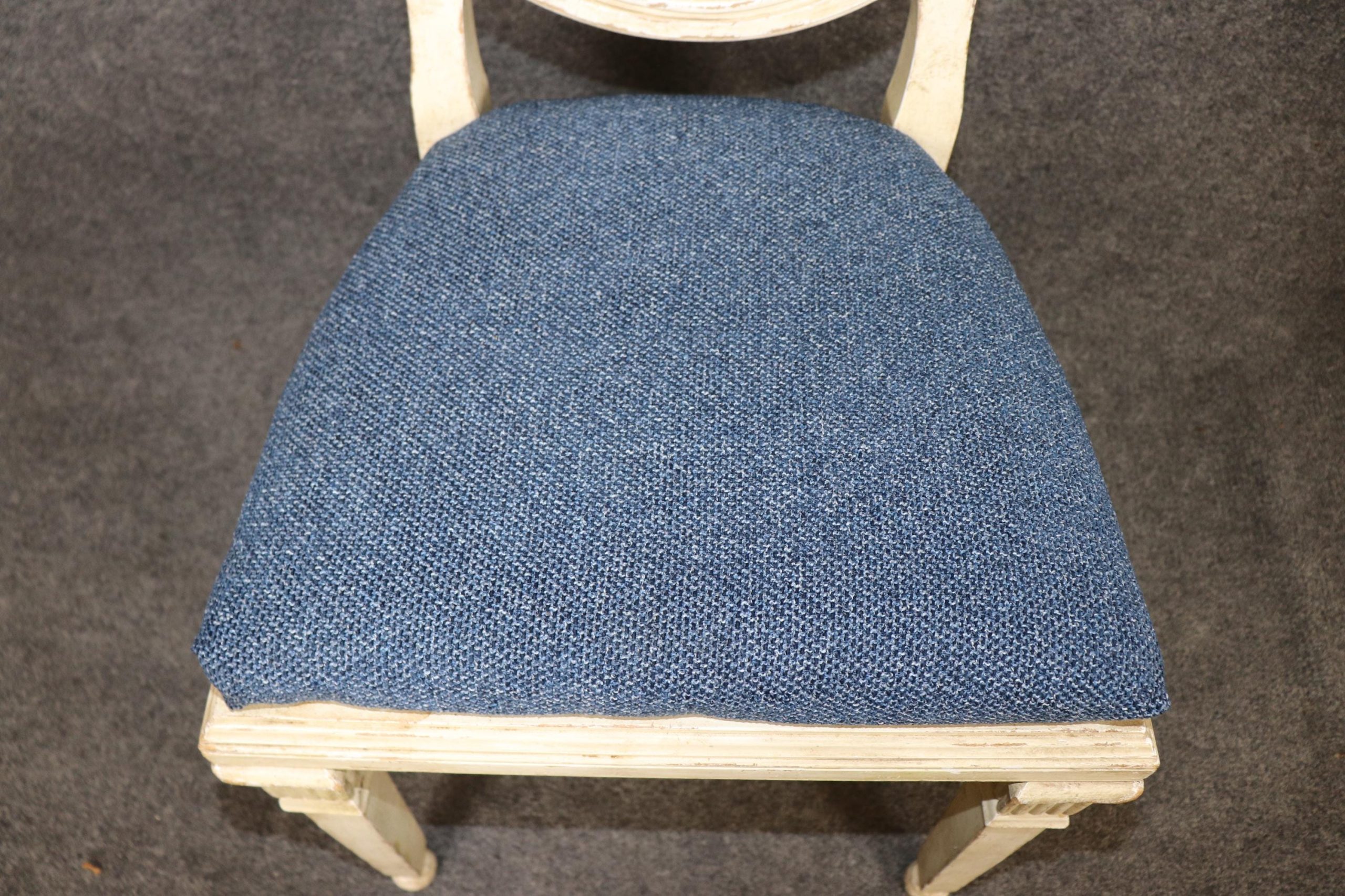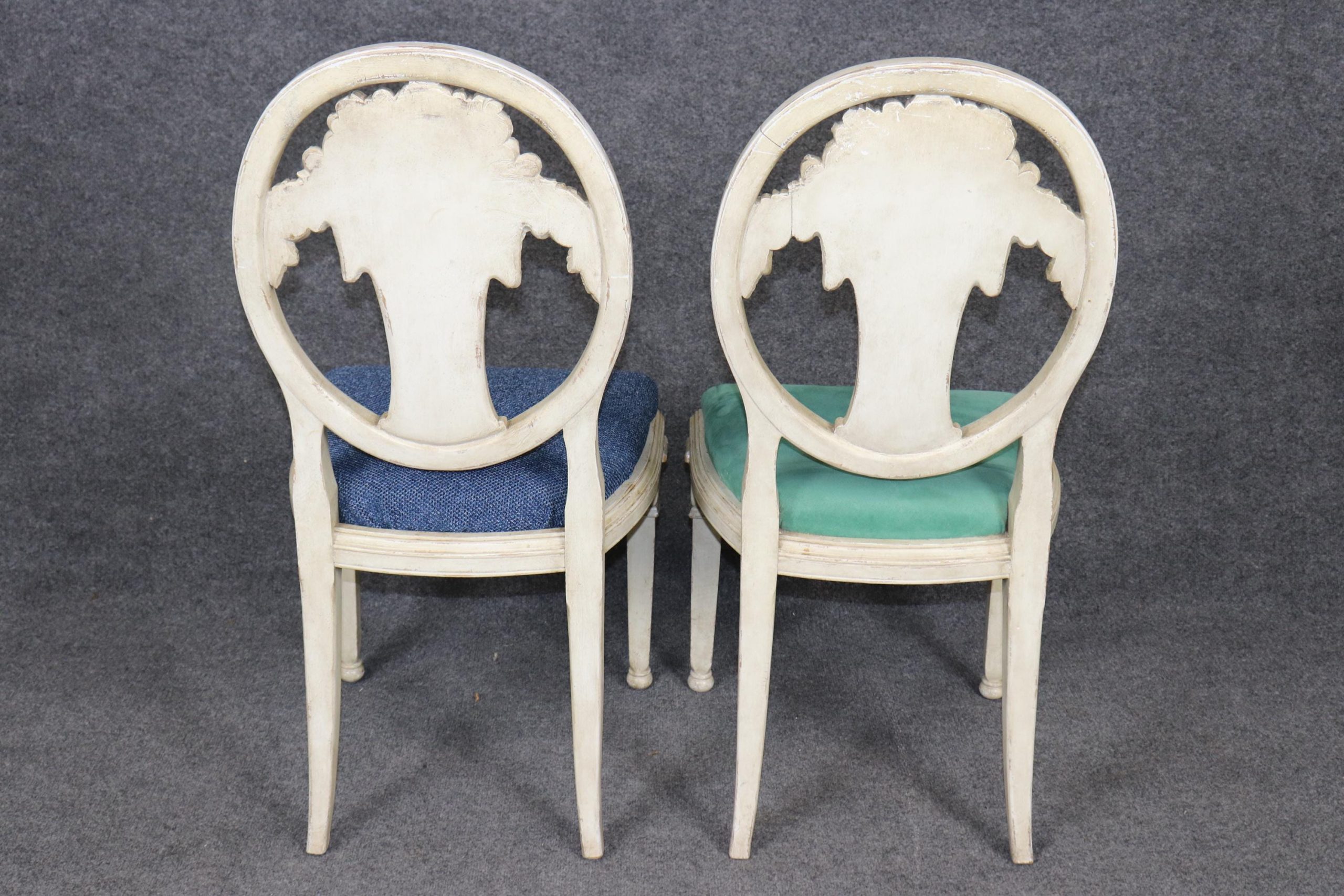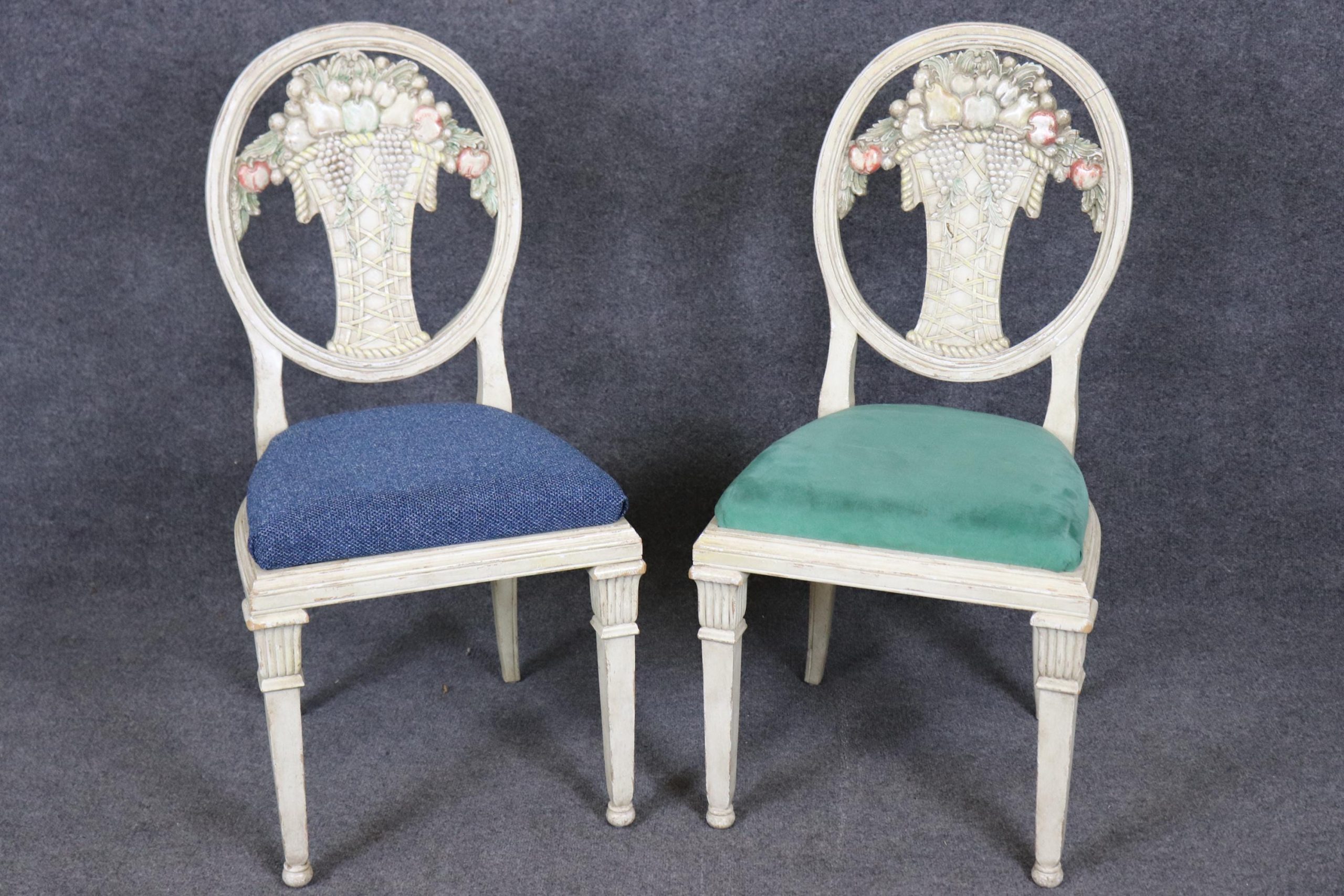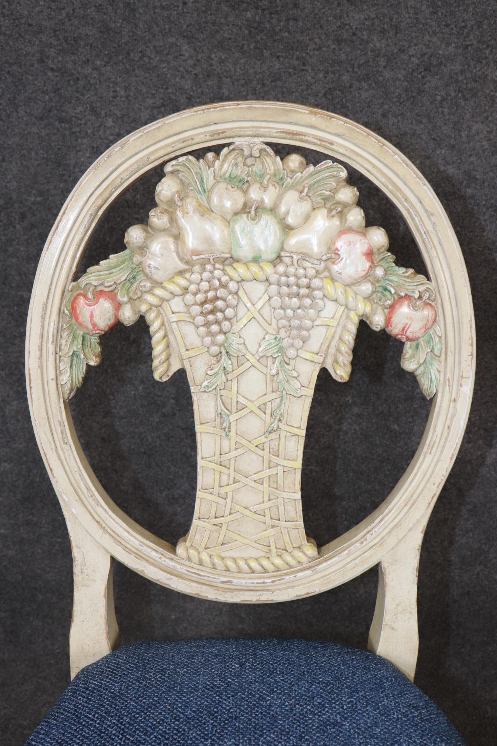This vintage Mid Century set of 6 Directoire style paint decorated side chairs is made of the highest quality! If you look at the photos provided you will see the attention to detail in the carved backs. This pair is perfect for any living room, kitchen, parlor, entryway or dining area and can even be used for a small game table. One really nice aspect to this pair is their ability to be used on a daily basis as they are strong and sturdy and not only for show. This pair is bound to bring a sense of luxury and character into your home or place of choosing and is bound to be a topic of conversation at your next gathering or event! Antique furniture and vintage pieces have stood the test of time and this set of chairs is no exception! With its quality materials and great craftsmanship this set is bound to last you and your family for many years to come. The pair is in good vintage condition with the exception of some finish loss and light surface scratches. The upholstery appears to be in good condition, but may show some signs of wear. Otherwise, good condition.