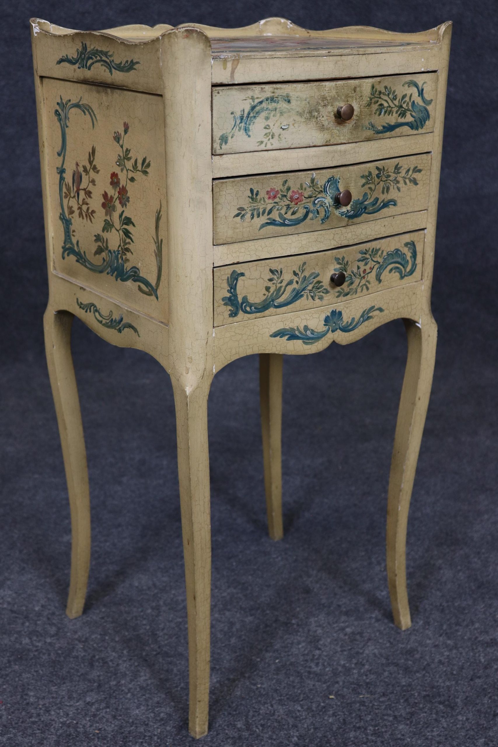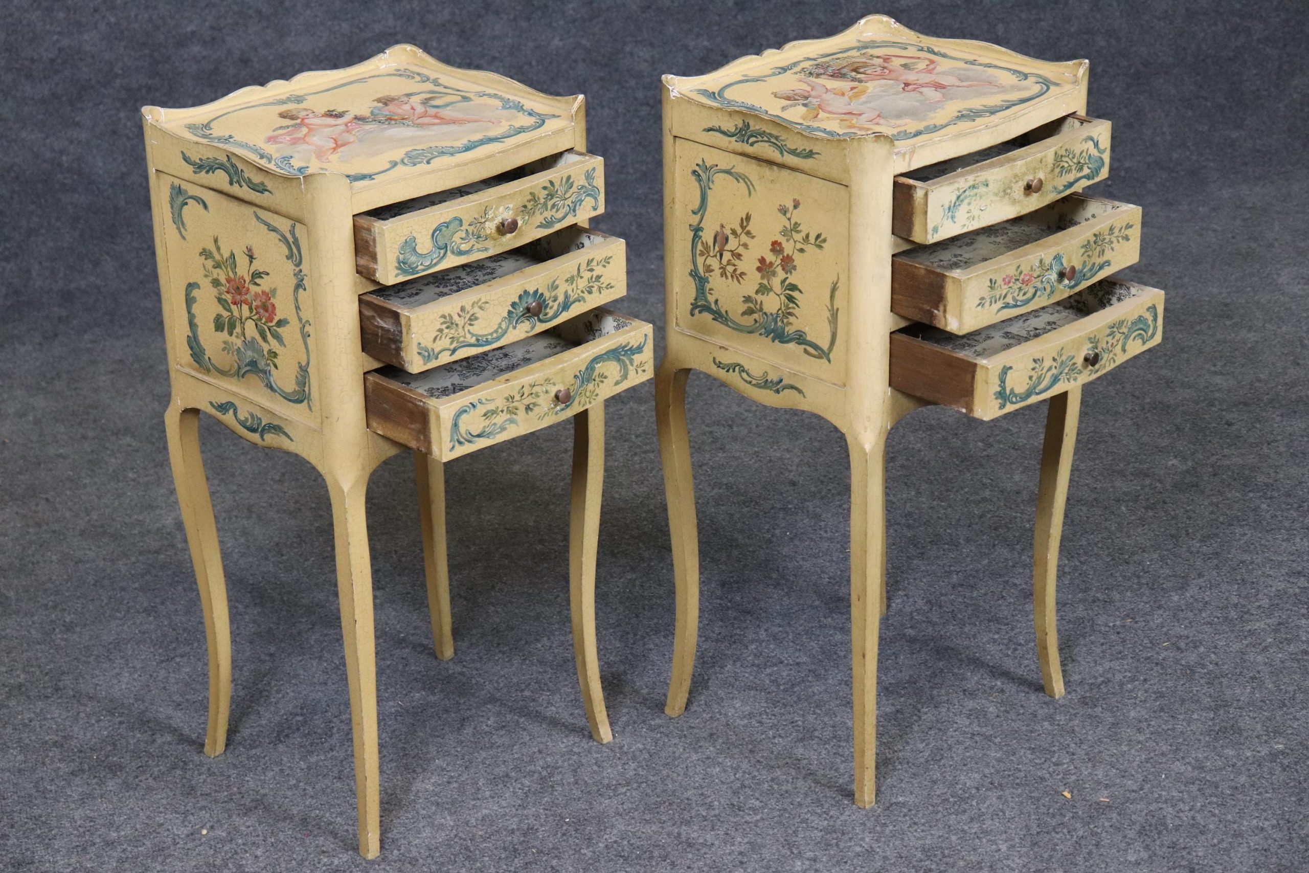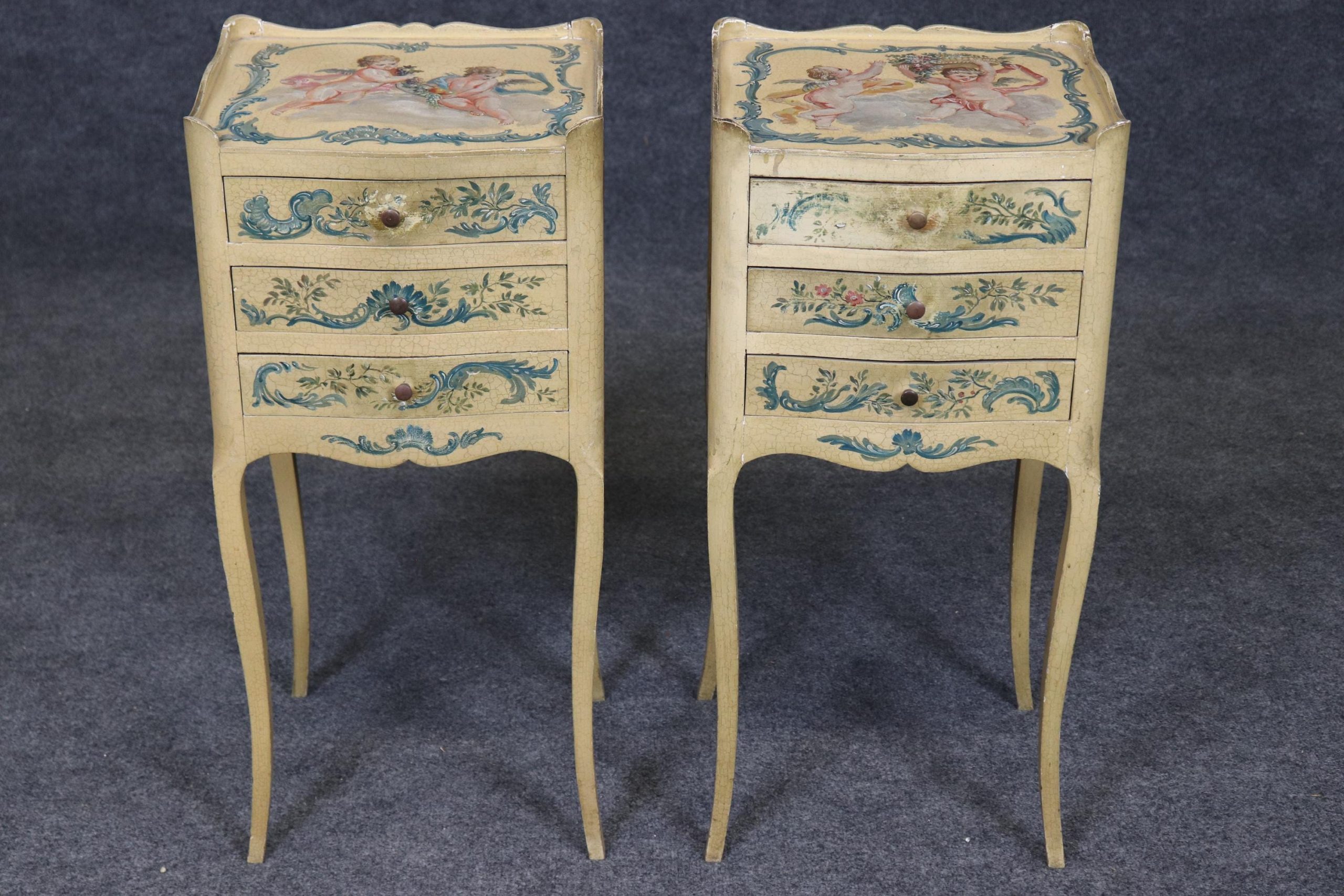 This pair of paint decorated Italian Venetian style bedside tables or nightstands are made of the highest quality and are perfect if you are looking to bring something into your home that nobody else will have! If you look at the photos provided, you can see the beautiful floral paint decoration depicting cherubs. These pieces are perfect for any living room, bedroom, office, or place of your choosing! They each have 3 drawers, perfect for storing your personal belongings. This pair of nightstands is extremely rare due to the fact that they are in fact a matching pair that is still together. Most of the time throughout generations pairs get separated due to relatives dividing items among one another once a family member has passed. Antiques and vintage items are known to stand the test of time as new furniture from brands such as IKEA are meant to deteriorate over a couple of years in order to have you buy more of their products. I can assure you this pair will last your family for many generations! The bedside tables are in vintage condition with normal age related chips, finish losses and wear as to be expected of items from the 1940s. Otherwise, in good condition.