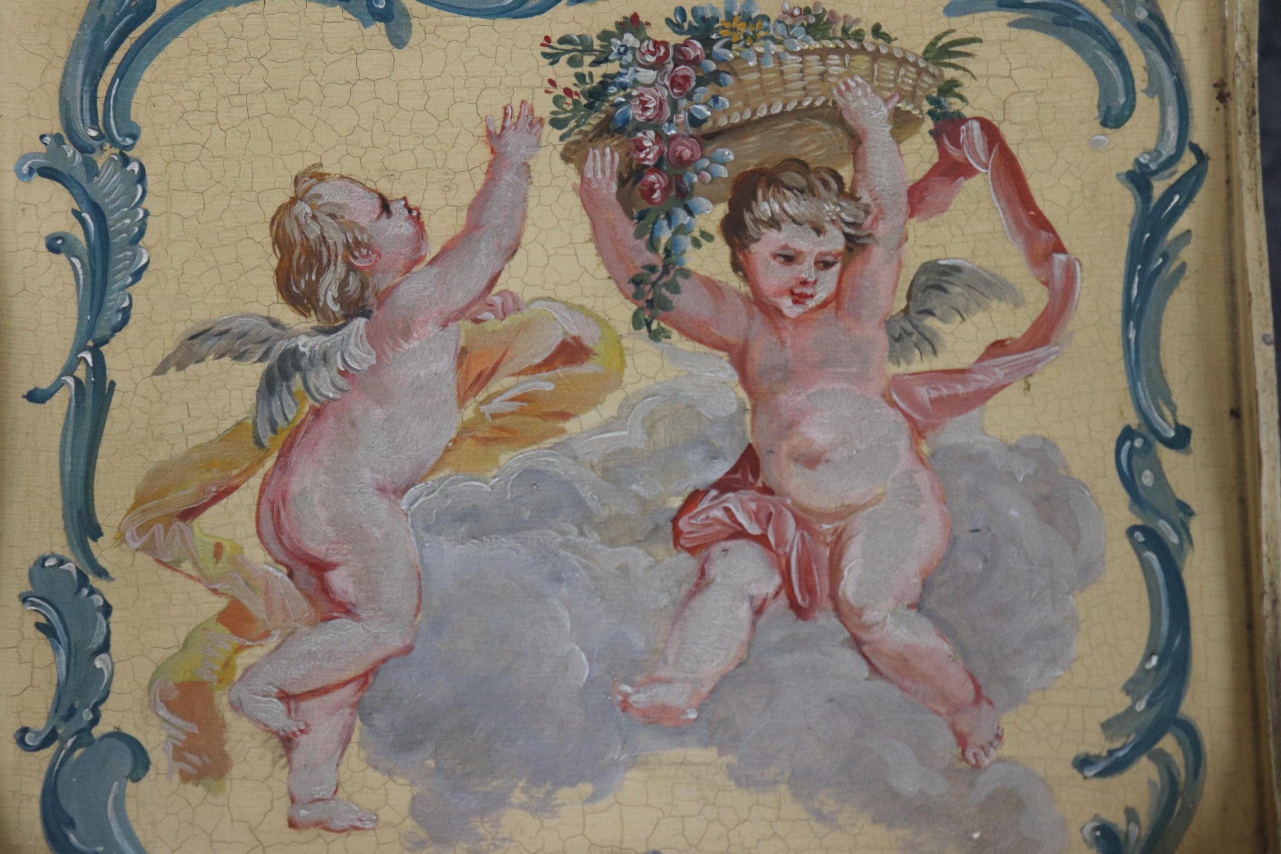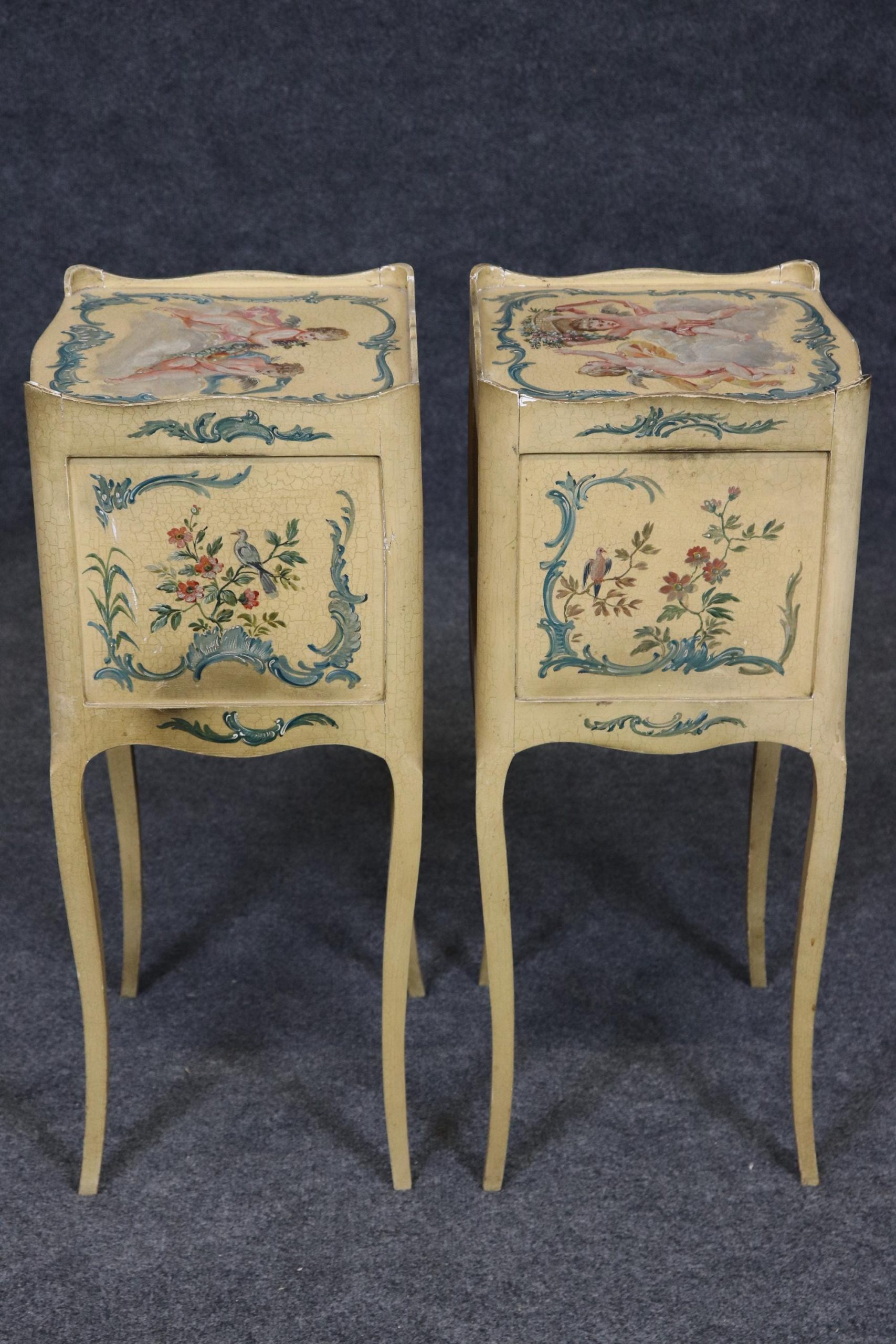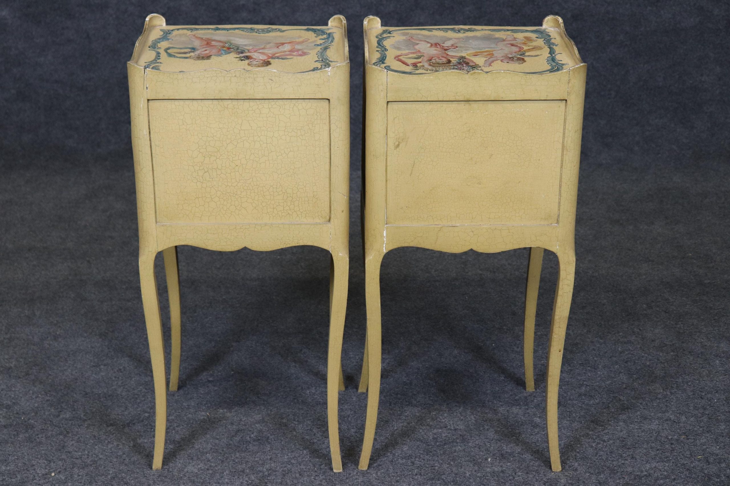 This pair of paint decorated Italian Venetian style bedside tables or nightstands are made of the highest quality and are perfect if you are looking to bring something into your home that nobody else will have! If you look at the photos provided, you can see the beautiful floral paint decoration depicting cherubs. These pieces are perfect for any living room, bedroom, office, or place of your choosing! They each have 3 drawers, perfect for storing your personal belongings. This pair of nightstands is extremely rare due to the fact that they are in fact a matching pair that is still together. Most of the time throughout generations pairs get separated due to relatives dividing items among one another once a family member has passed. Antiques and vintage items are known to stand the test of time as new furniture from brands such as IKEA are meant to deteriorate over a couple of years in order to have you buy more of their products. I can assure you this pair will last your family for many generations! The bedside tables are in vintage condition with normal age related chips, finish losses and wear as to be expected of items from the 1940s. Otherwise, in good condition.